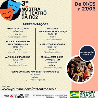 Projeto cultural que acontece de 1º de maio a 27 de junho foi contemplado pela ‘Lei 14.017’, denominada ‘Lei Aldir Blanc (LAB) – Secretaria de Cultura (SECULT) e Governo de Minas’; Amor de Salto Alto, Jaceflopim Uma Viagem na Imaginação e Auto da Compadecida são alguns dos espetáculos transmitidos pelo: https://youtube.com/c/RC2TeatroEscola