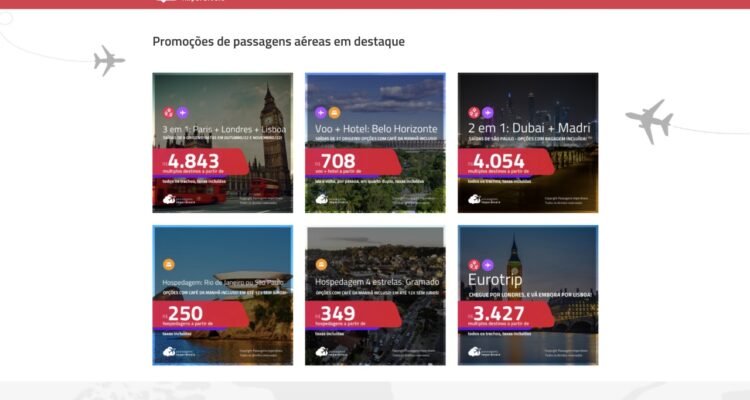 1 – Na tela inicial, a aba promoções mostrará viagens nacionais e internacionais, com opções de passagens aéreas ou pacotes completos (voo e hospedagem) para diversos destinos.